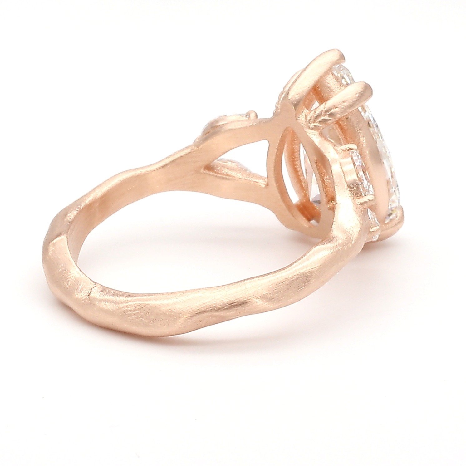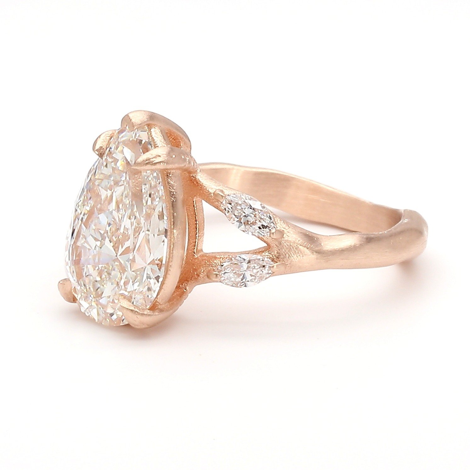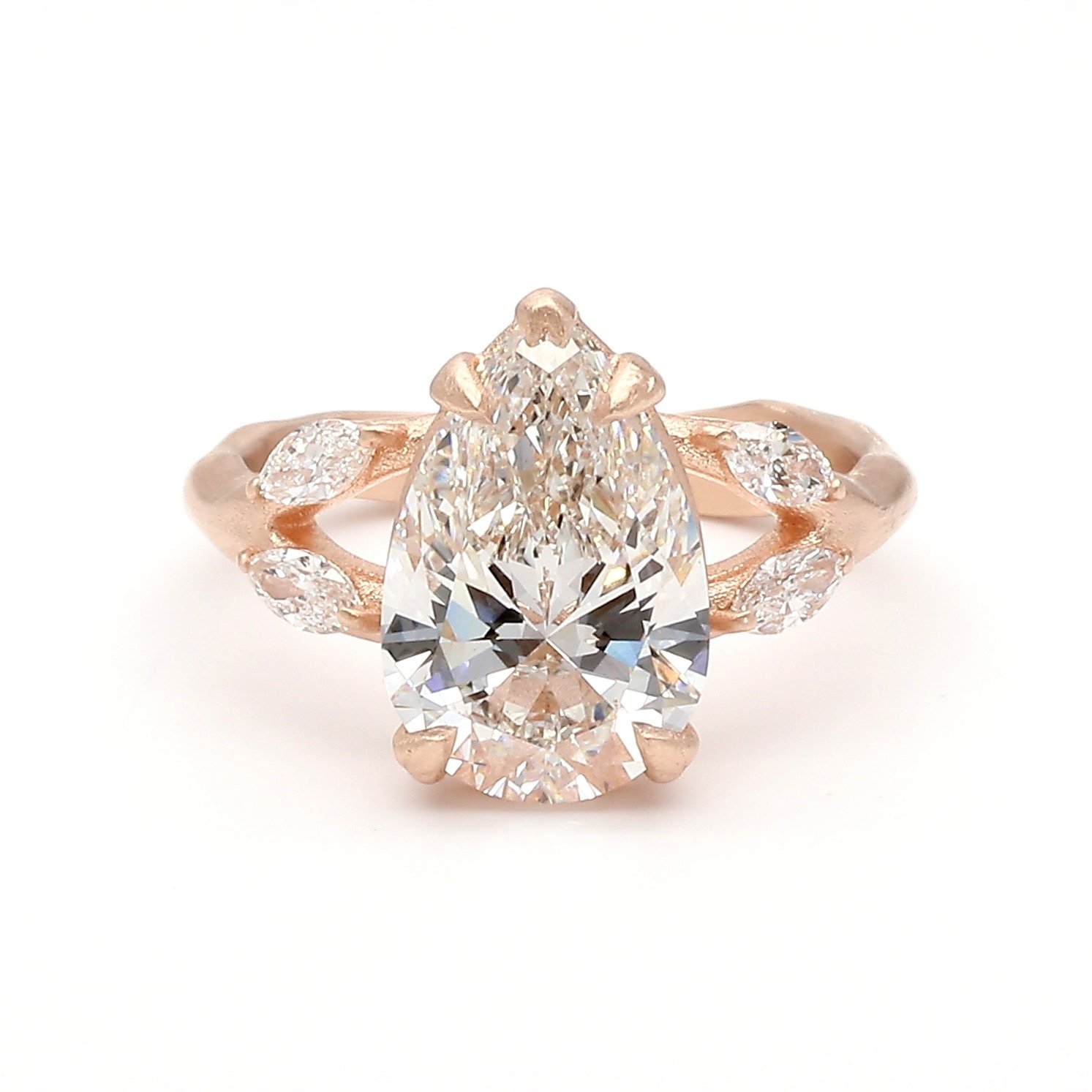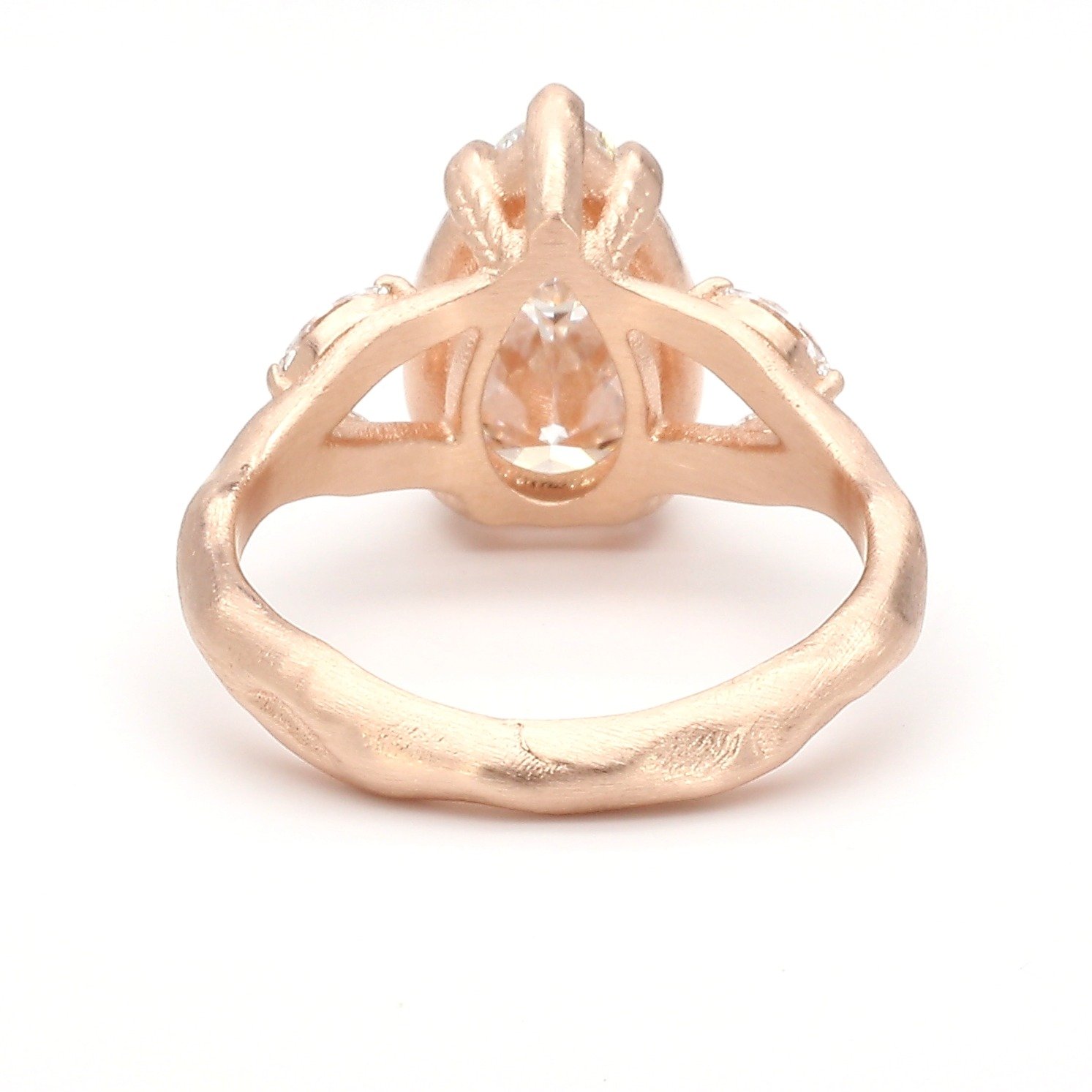This Lilou diamond engagement ring features a large pear-cut diamond held securely by a distinctive prong setting designed with organic, flowing lines. The band itself is finished with a subtle, textured appearance, reminiscent of a natural vine or branch, which anchors the nature-inspired theme. This elegant design is further enhanced by two pairs of marquise or smaller pear-cut accent diamonds embedded in the shoulders, creating the impression of delicate leaves budding from the main structure. The entire piece successfully blends the brilliance of the diamonds with an earthy, sculptural setting, and you can create this setting in any metal, not limited to only rose gold.