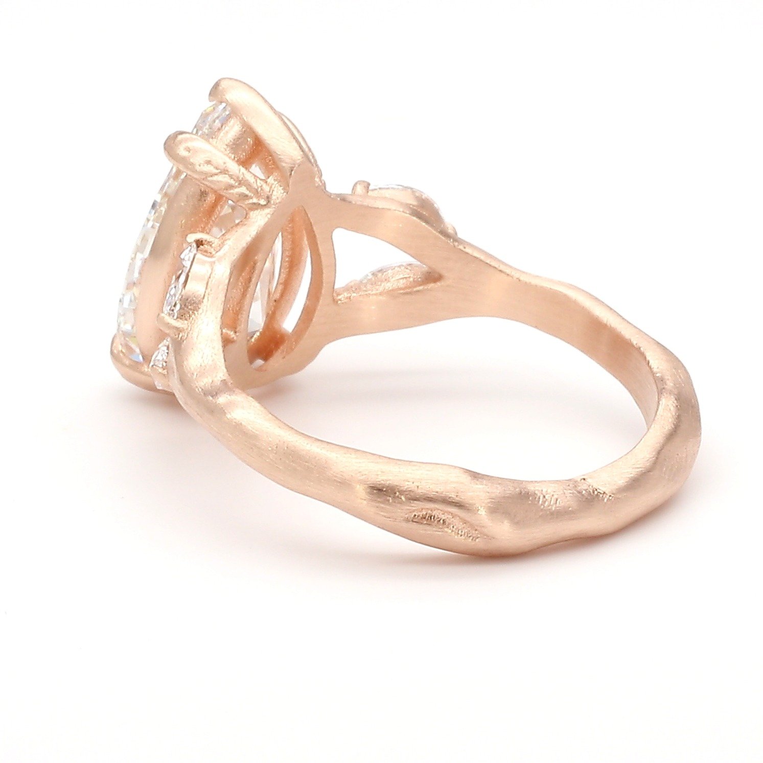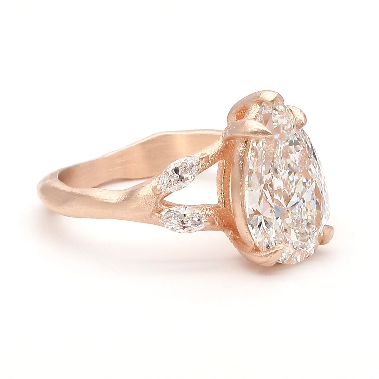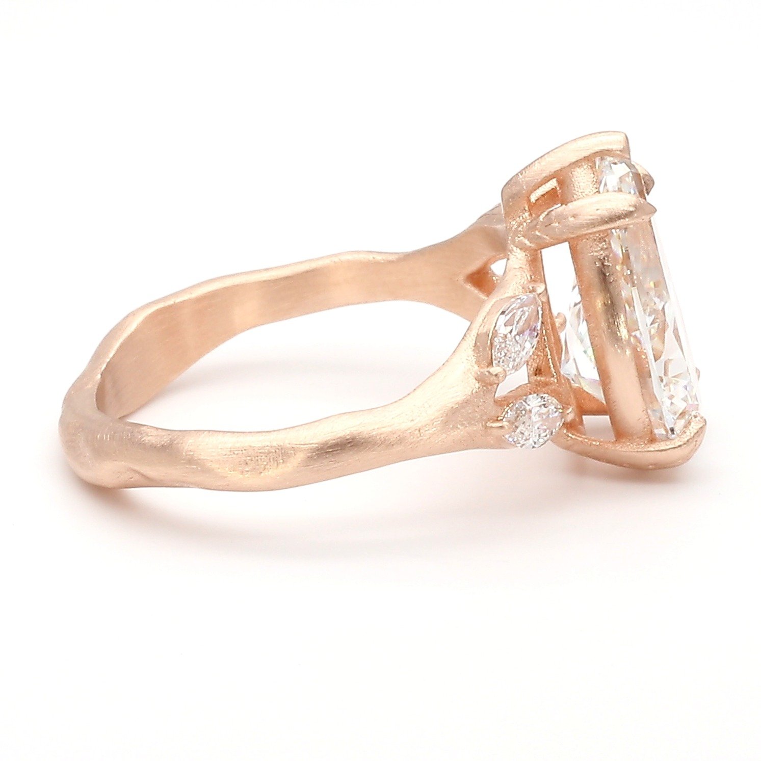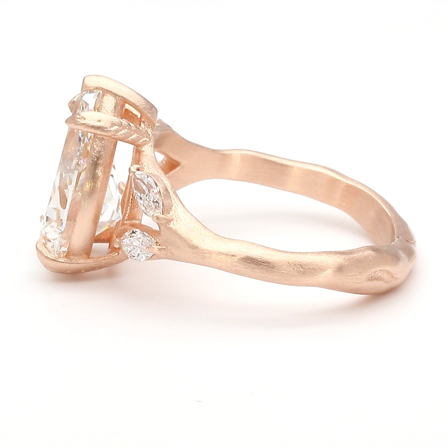 This Lilou diamond engagement ring features a large pear-cut diamond held securely by a distinctive prong setting designed with organic, flowing lines. The band itself is finished with a subtle, textured appearance, reminiscent of a natural vine or branch, which anchors the nature-inspired theme. This elegant design is further enhanced by two pairs of marquise or smaller pear-cut accent diamonds embedded in the shoulders, creating the impression of delicate leaves budding from the main structure. The entire piece successfully blends the brilliance of the diamonds with an earthy, sculptural setting, and you can create this setting in any metal, not limited to only rose gold.