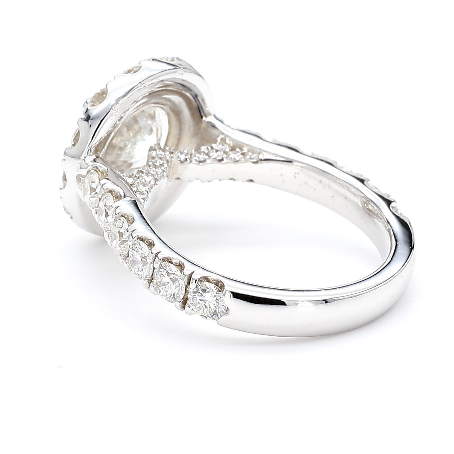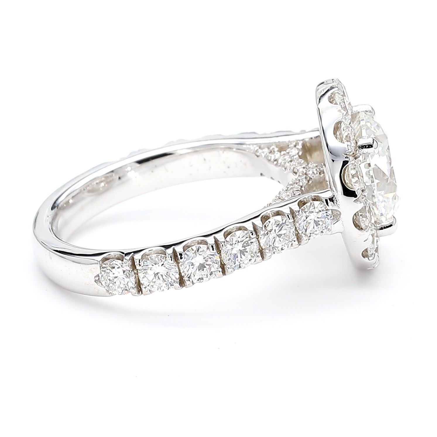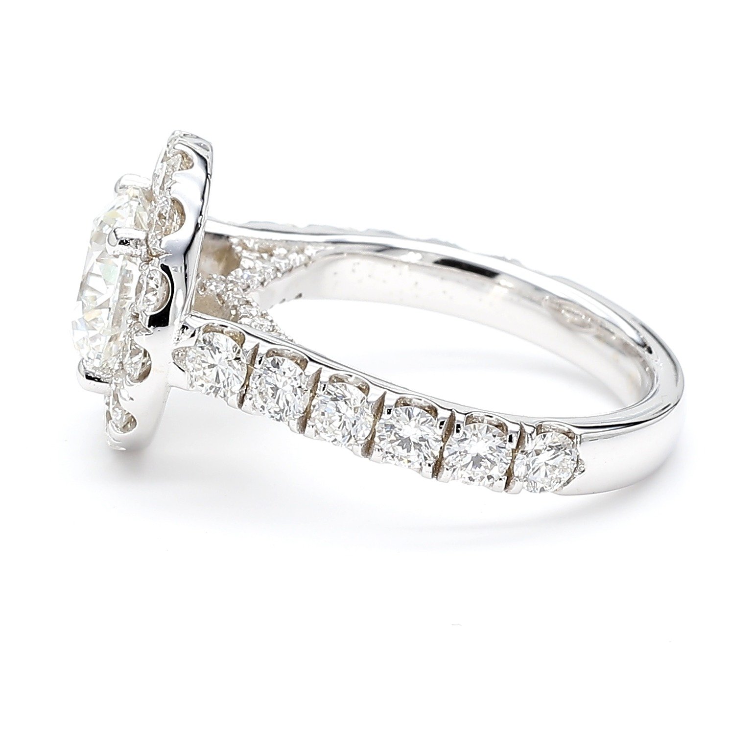 The Lucia Diamond Engagement Ring showcases timeless sophistication with its elegant design and exquisite craftsmanship. Set in high-polish platinum white/yellow gold, the ring features a brilliant round-cut center diamond encircled by a delicate halo of pavé-set diamonds that amplify its sparkle. The band is adorned with a row of meticulously matched round diamonds extending halfway down the shank, offering a seamless display of brilliance. The open gallery and cathedral-style shoulders add depth and light performance, creating a refined balance between classic beauty and modern allure.