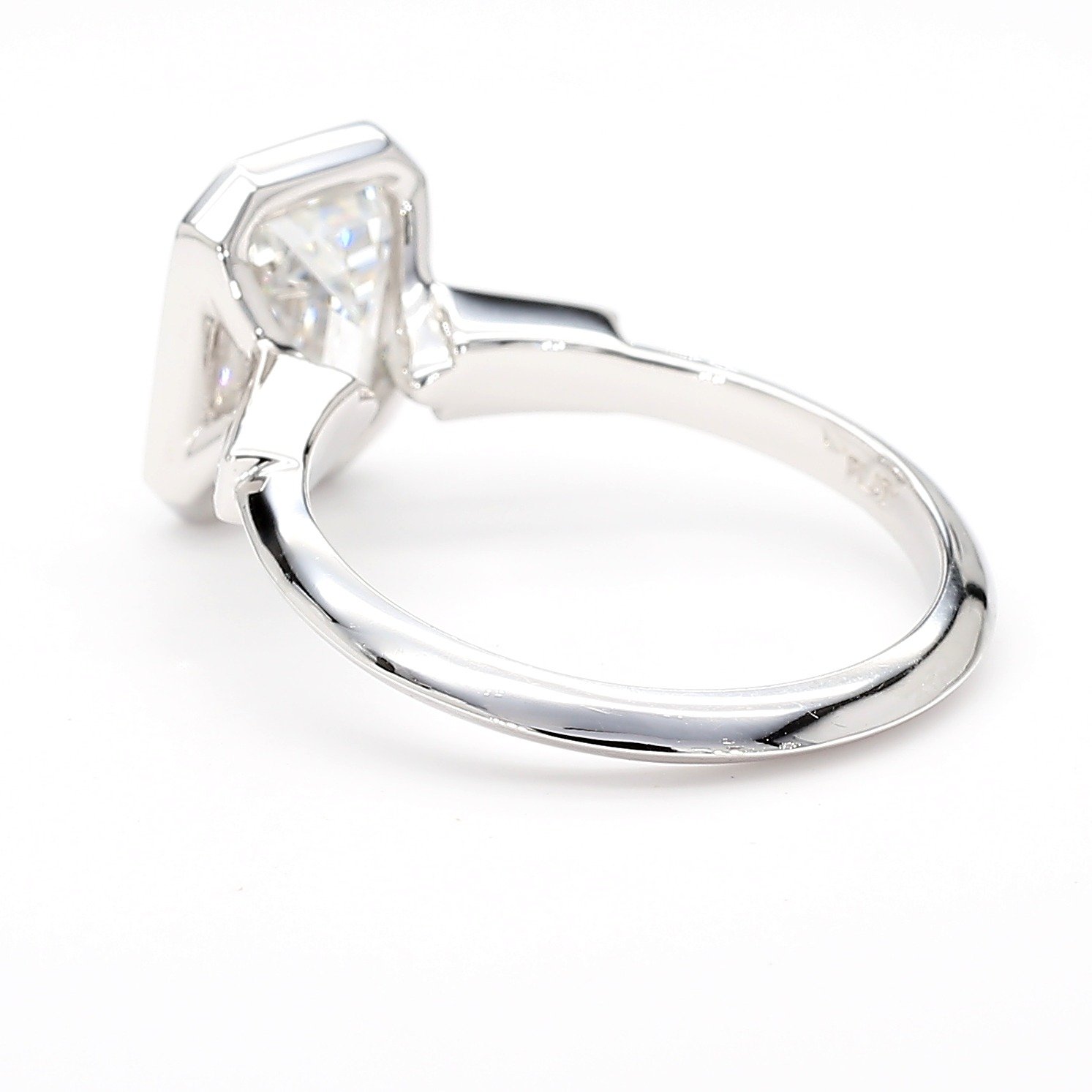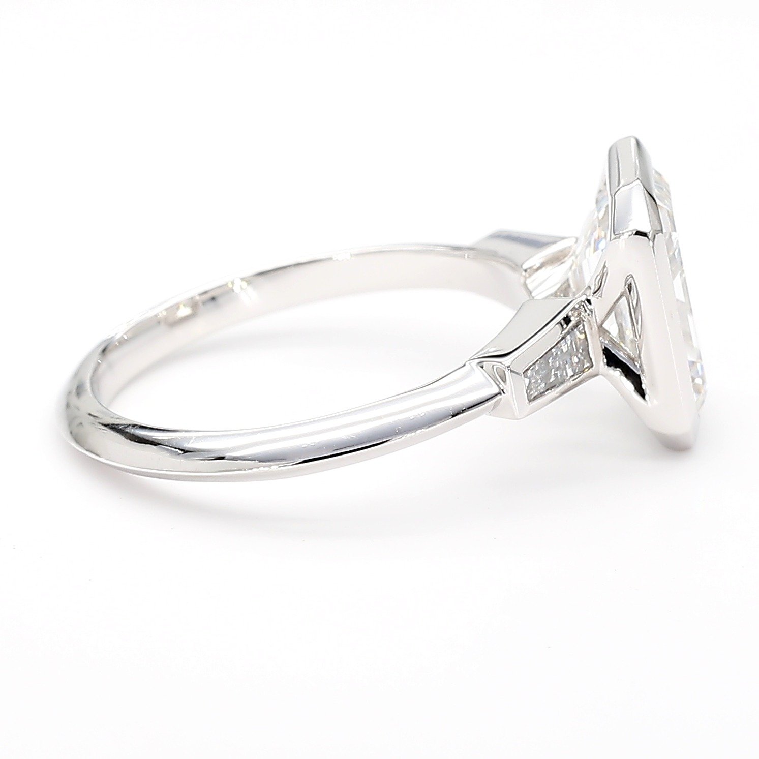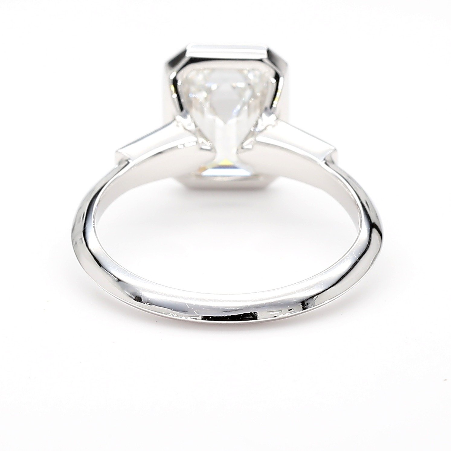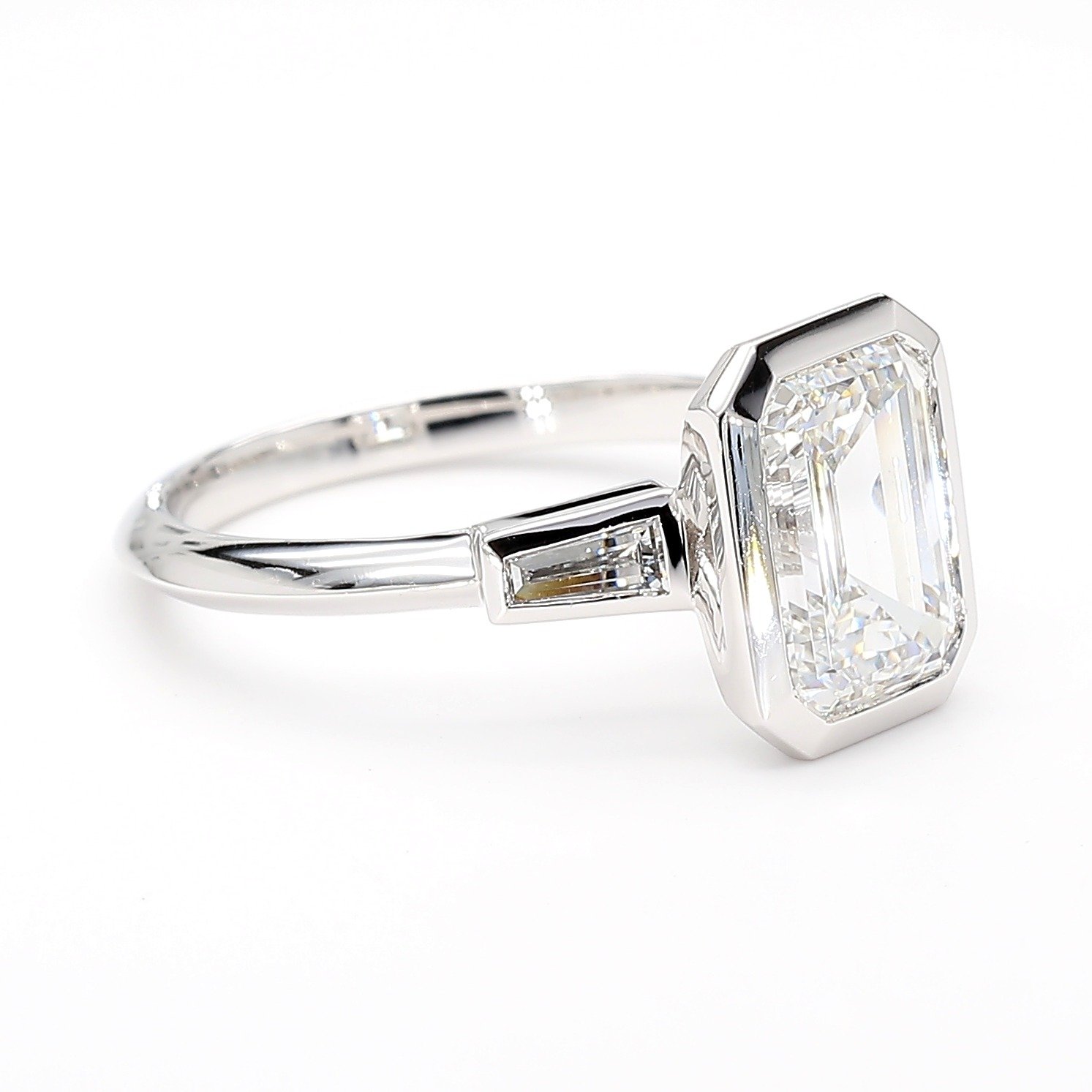 The Margaux Diamond Engagement Ring is an art deco design that meets contemporary trends. Two tapered baguettes adorn your main stone in a gorgeous bezel set design. Inspired by the renaissance era, the Margaux was the name of choice for many queens and princesses throughout Europe. This setting captures that moment in history where bold beauty was featured in many of the fine arts of the time mounted with a Lab Grown 2.70 E Color VVS2 Clarity Emerald.