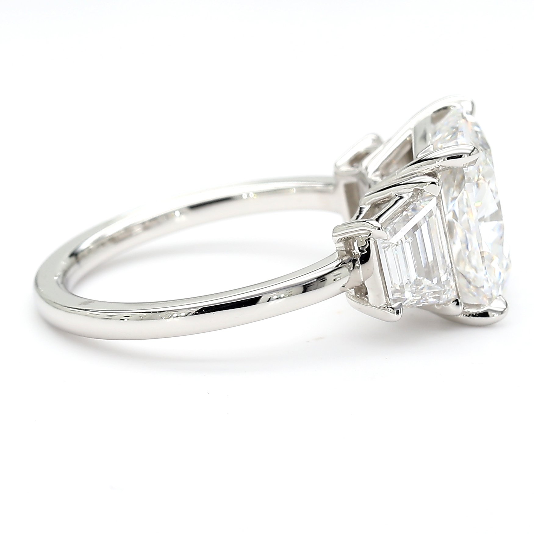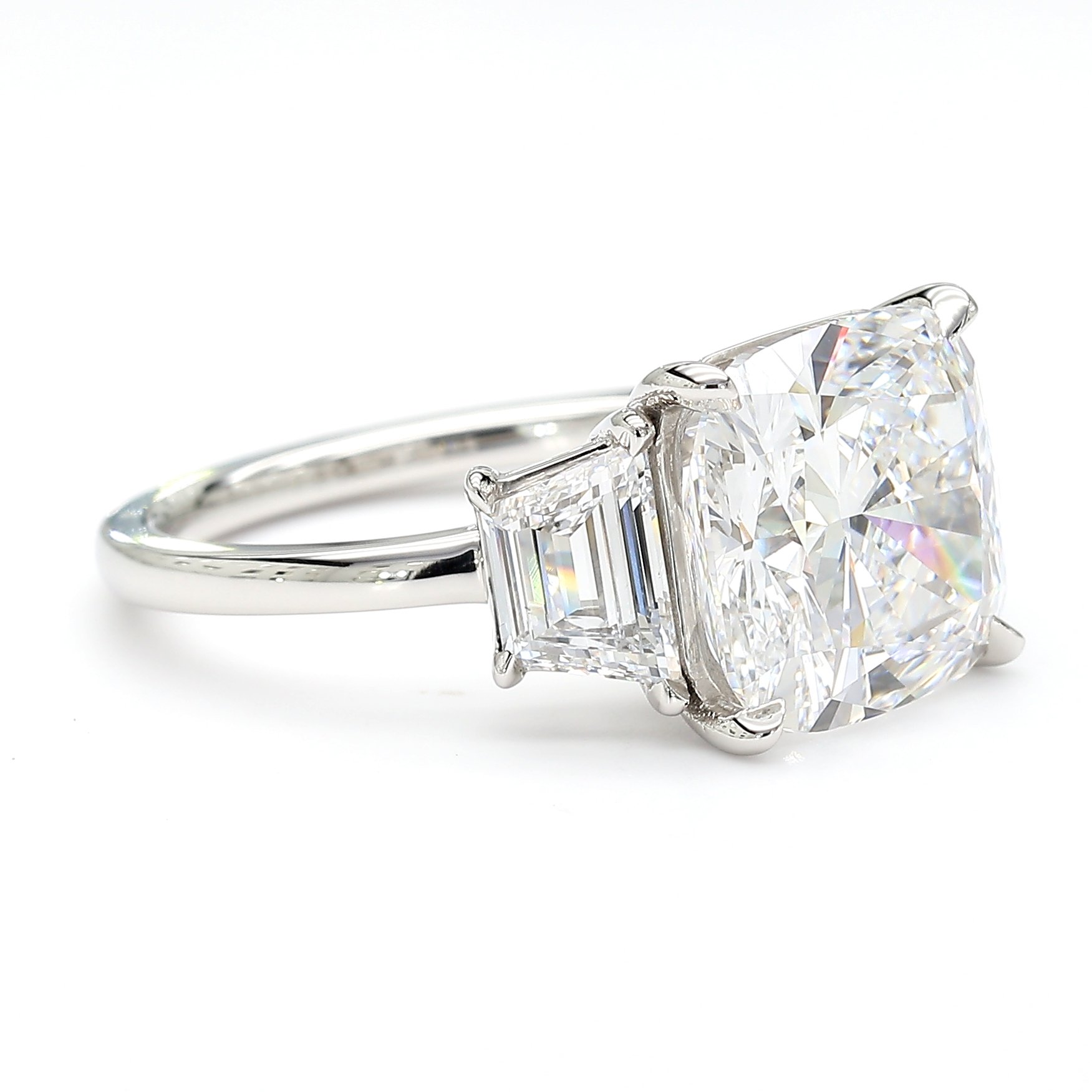 4.73 CARAT CUSHION D COLOR VVS2 CLARITY ON OUR PLATINUM THREE-STONE TRAPEZOID DIAMOND ENGAGEMENT RING ON