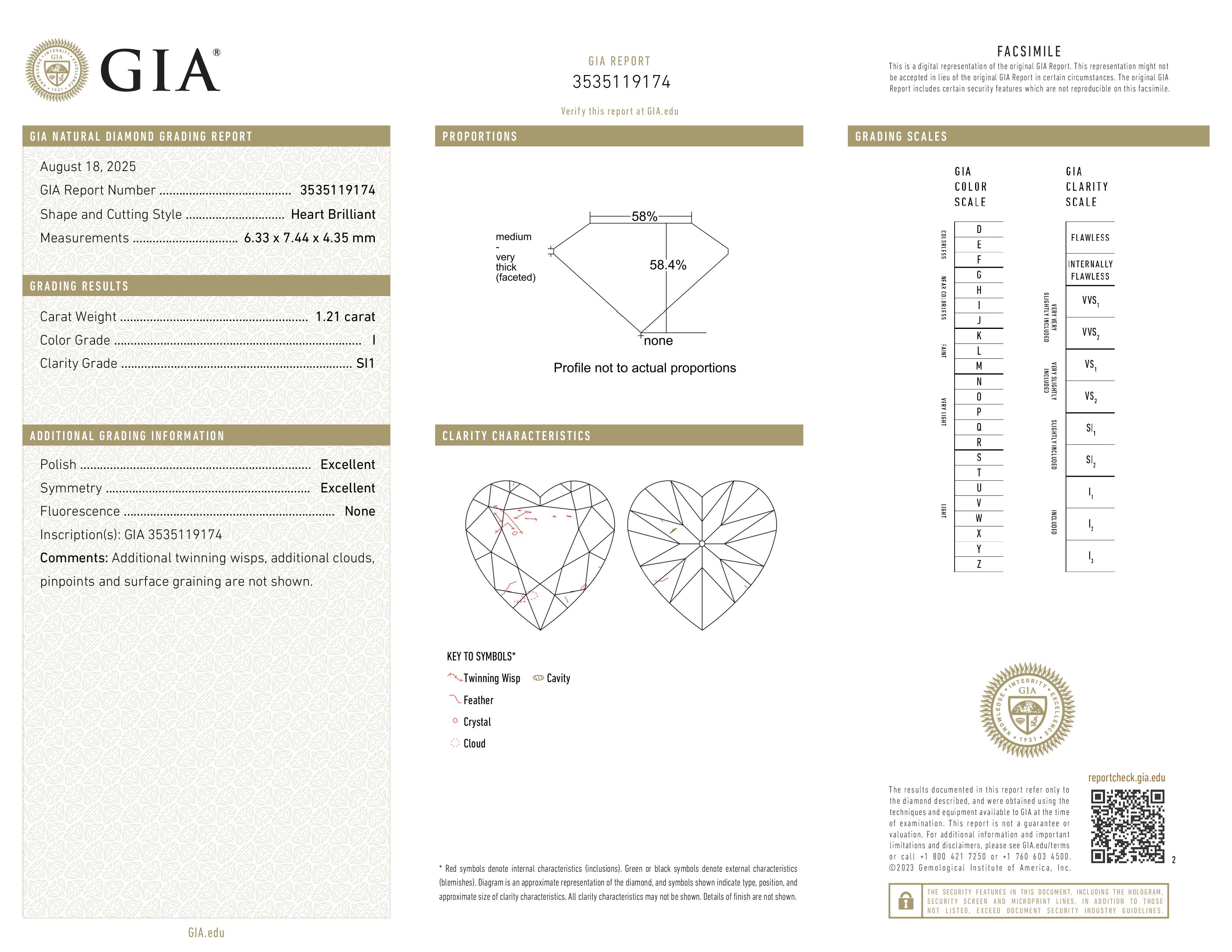 (SI1) This diamond contains few inclusions detectable using 10x magnification. However, when the diamond is set in jewelry, these inclusions are not usually visible to the naked eye. The SI1 graded diamonds are less expensive then higher clarity graded and therefore offer exceptional value for those that want to stay within budget and get a larger diamond. If you're unsure and want our opinion, just let us know and one of our gemologists will review it for you.