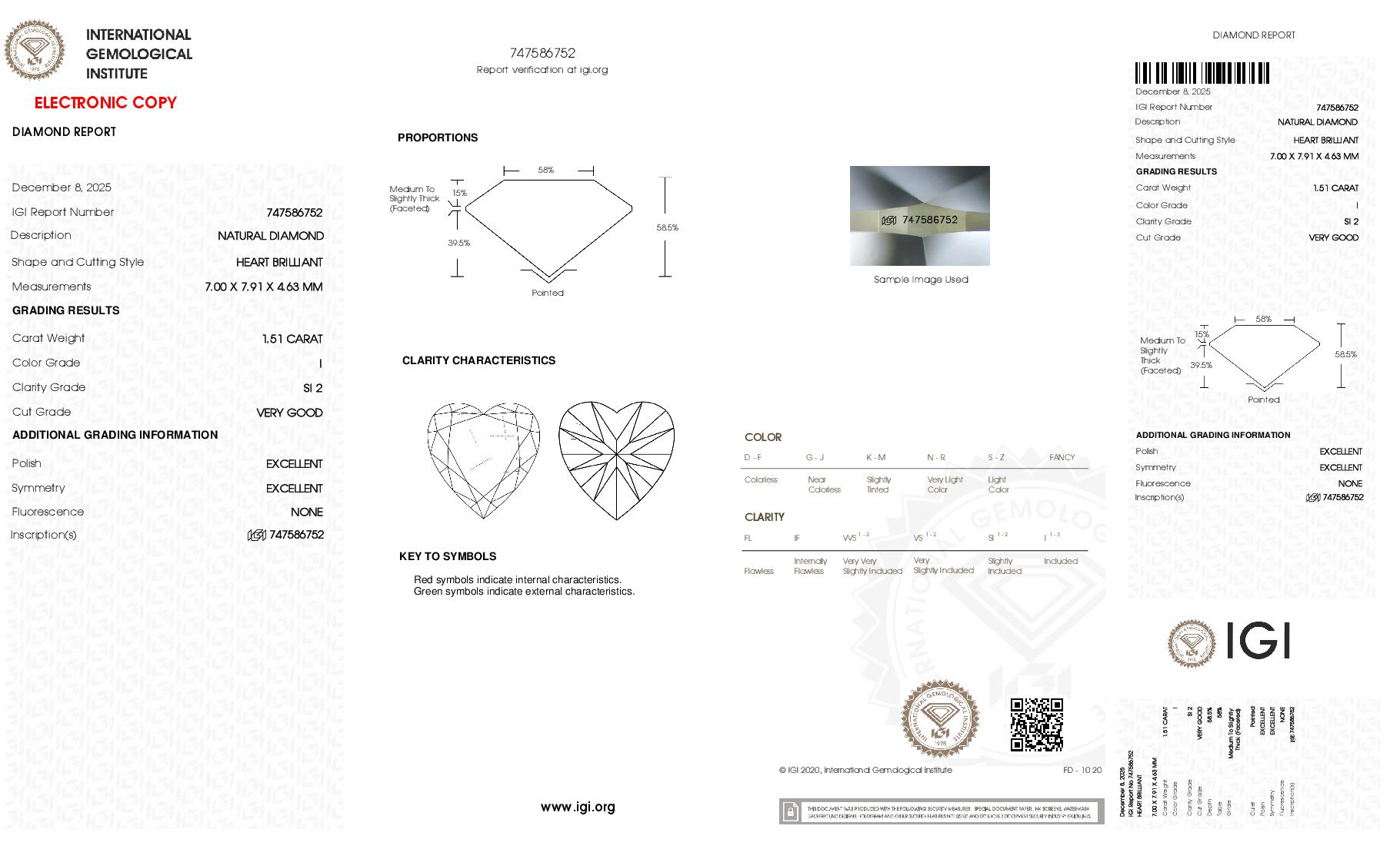 (SI2) Some inclusions are detectable under 10x magnification, even to the untrained eye. However, when the diamond is set in jewelry, these inclusions are not usually visible to the naked eye. The SI2 graded diamonds are less expensive then higher clarity graded and therefore offer exceptional value for those that want to stay within budget and get a larger diamond. If you're unsure and want our opinion, just let us know and one of our gemologists will review it for you.