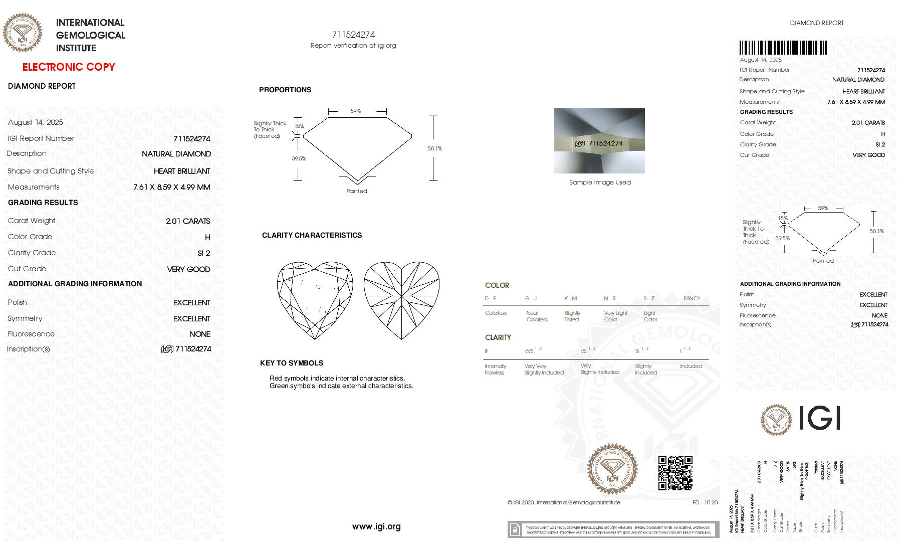 (SI2) Some inclusions are detectable under 10x magnification, even to the untrained eye. However, when the diamond is set in jewelry, these inclusions are not usually visible to the naked eye. The SI2 graded diamonds are less expensive then higher clarity graded and therefore offer exceptional value for those that want to stay within budget and get a larger diamond. If you're unsure and want our opinion, just let us know and one of our gemologists will review it for you.