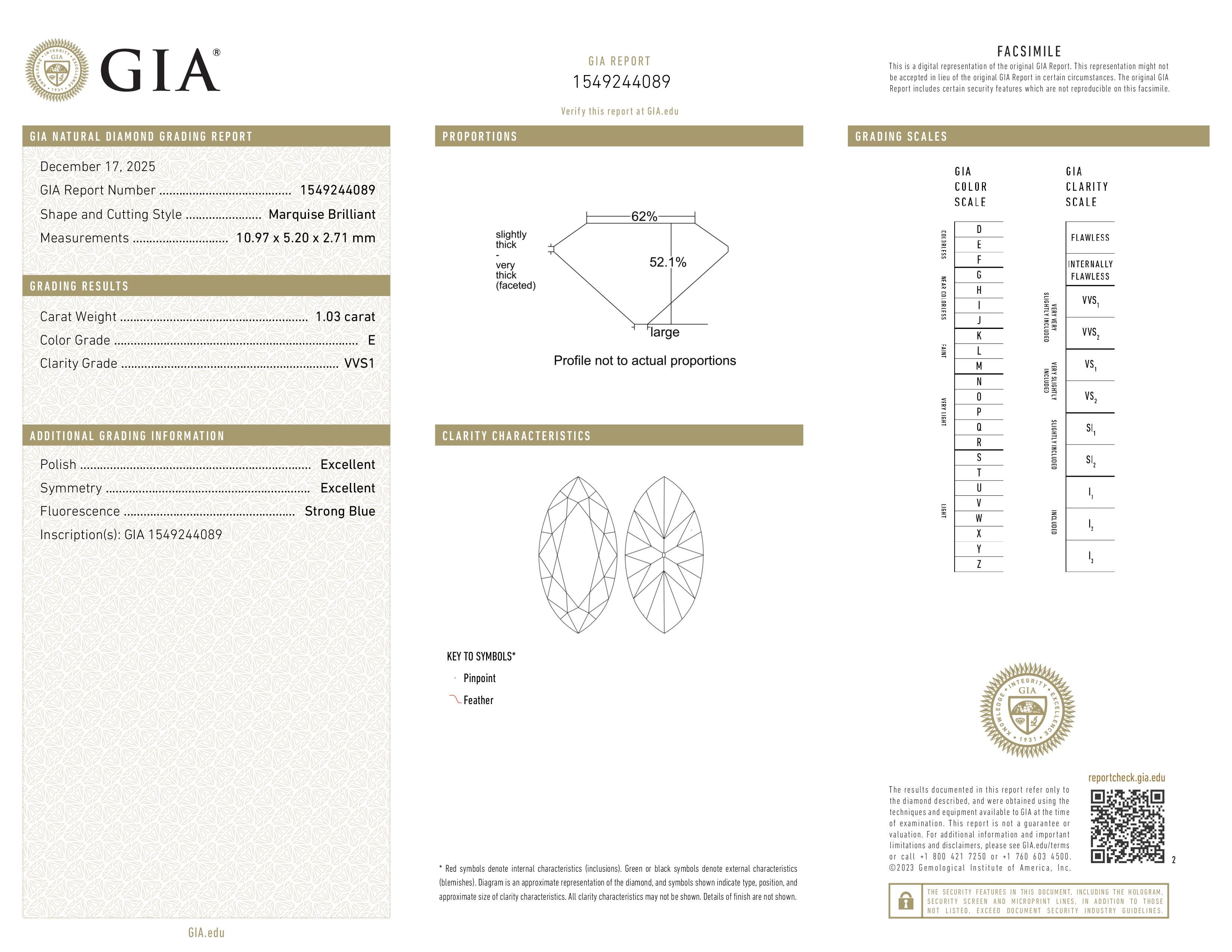(Excellent) This diamond is cut to the highest standards determined by grading laboratories. Reflecting virtually all the light that enters, this diamond was cut to maximize brilliance and sparkle. Excellent cuts are exceptionally fine and rare and have ideal proportions and finish characteristics.