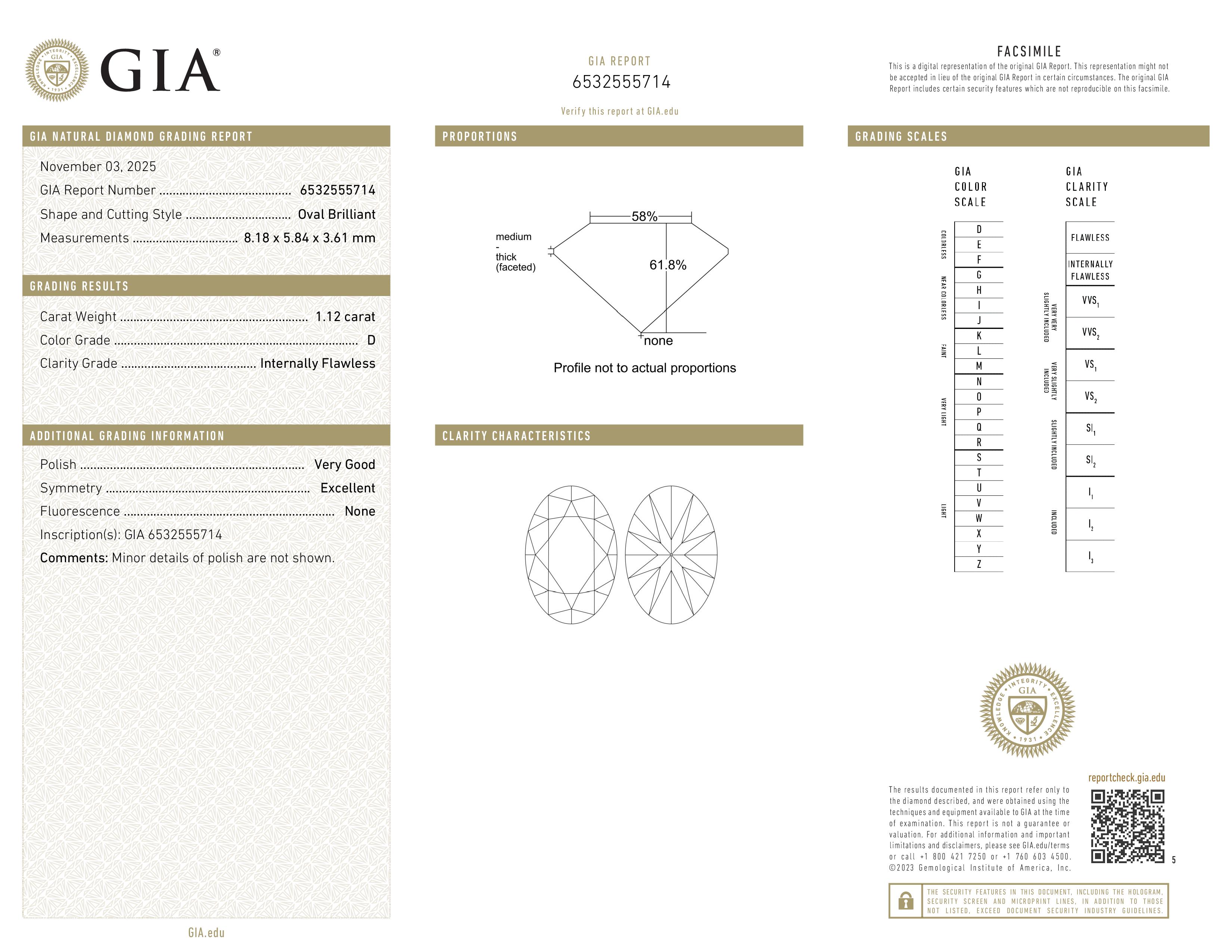 (IF) This diamond contains no internal inclusions when examined by a skilled grader even under high microscopic magnification. The only difference between this diamond and a flawless diamond are extremely minor markings or blemishes on the surface when viewed under 30X magnification. IF is considered top-quality and extremely rare.