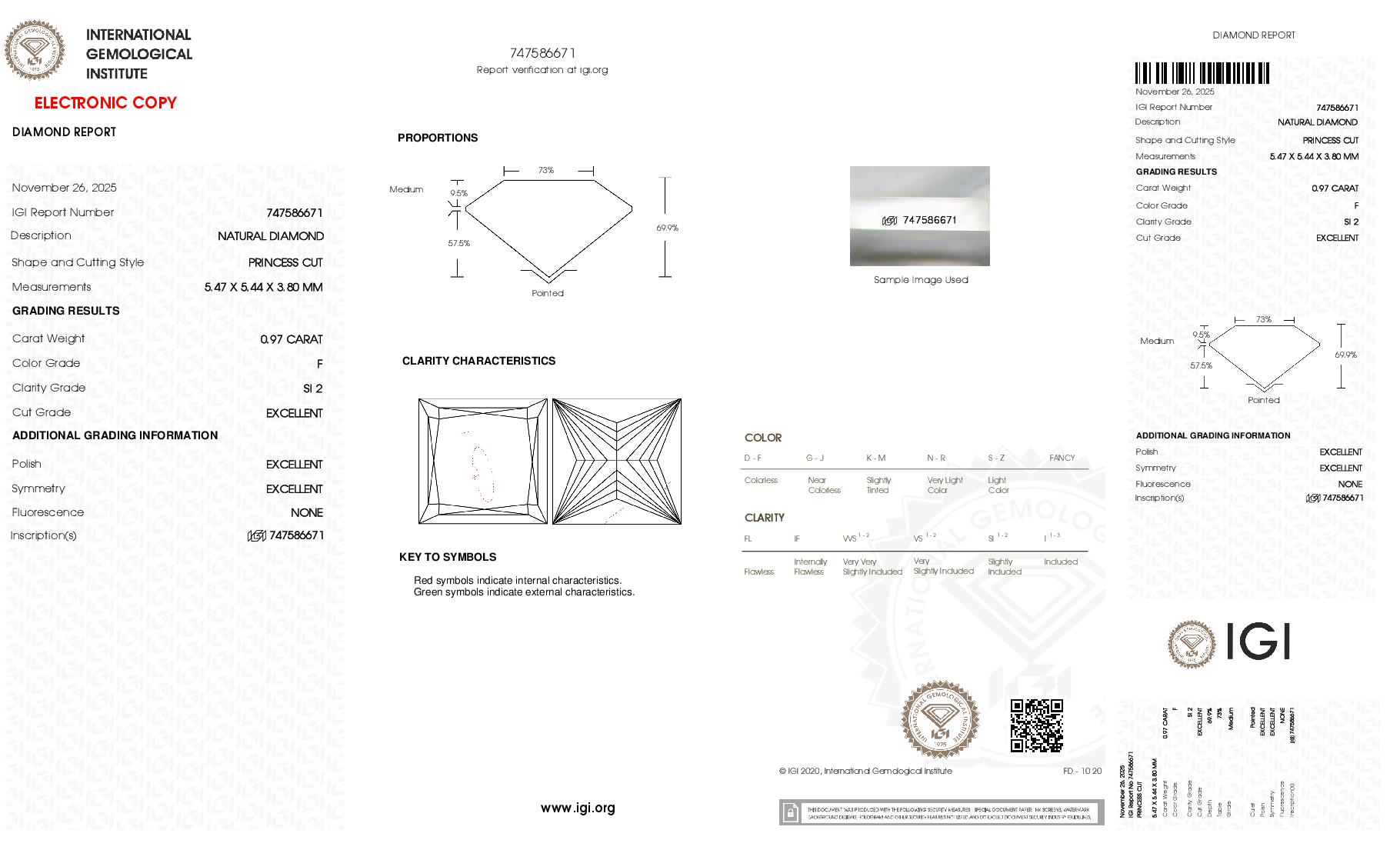 (Excellent) This diamond is cut to the highest standards determined by grading laboratories. Reflecting virtually all the light that enters, this diamond was cut to maximize brilliance and sparkle. Excellent cuts are exceptionally fine and rare and have ideal proportions and finish characteristics.