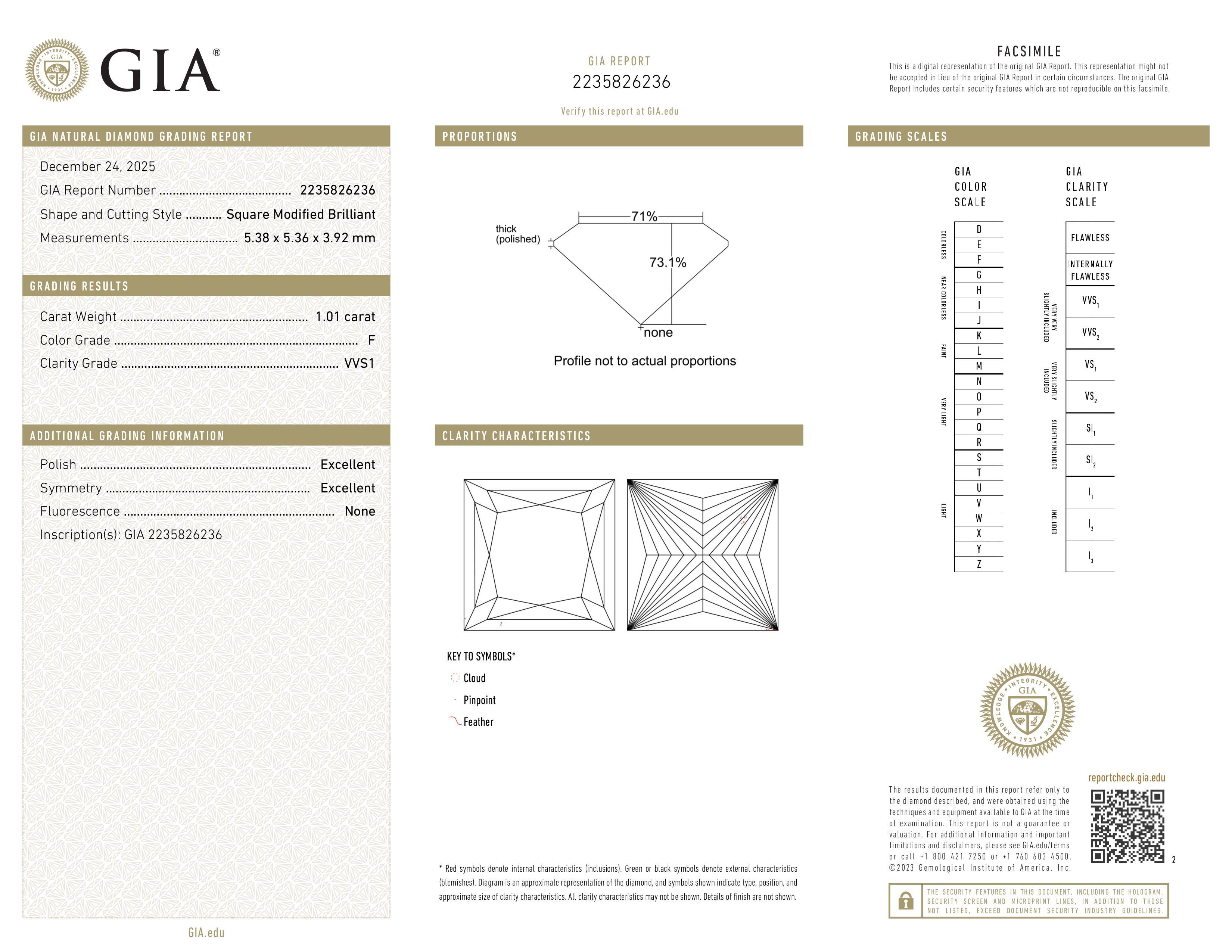 (VVS1) This diamond has very, very small inclusions. The minute inclusions are difficult for even a trained grader to see under 30x magnification. VVS1 graded diamonds are very rare.