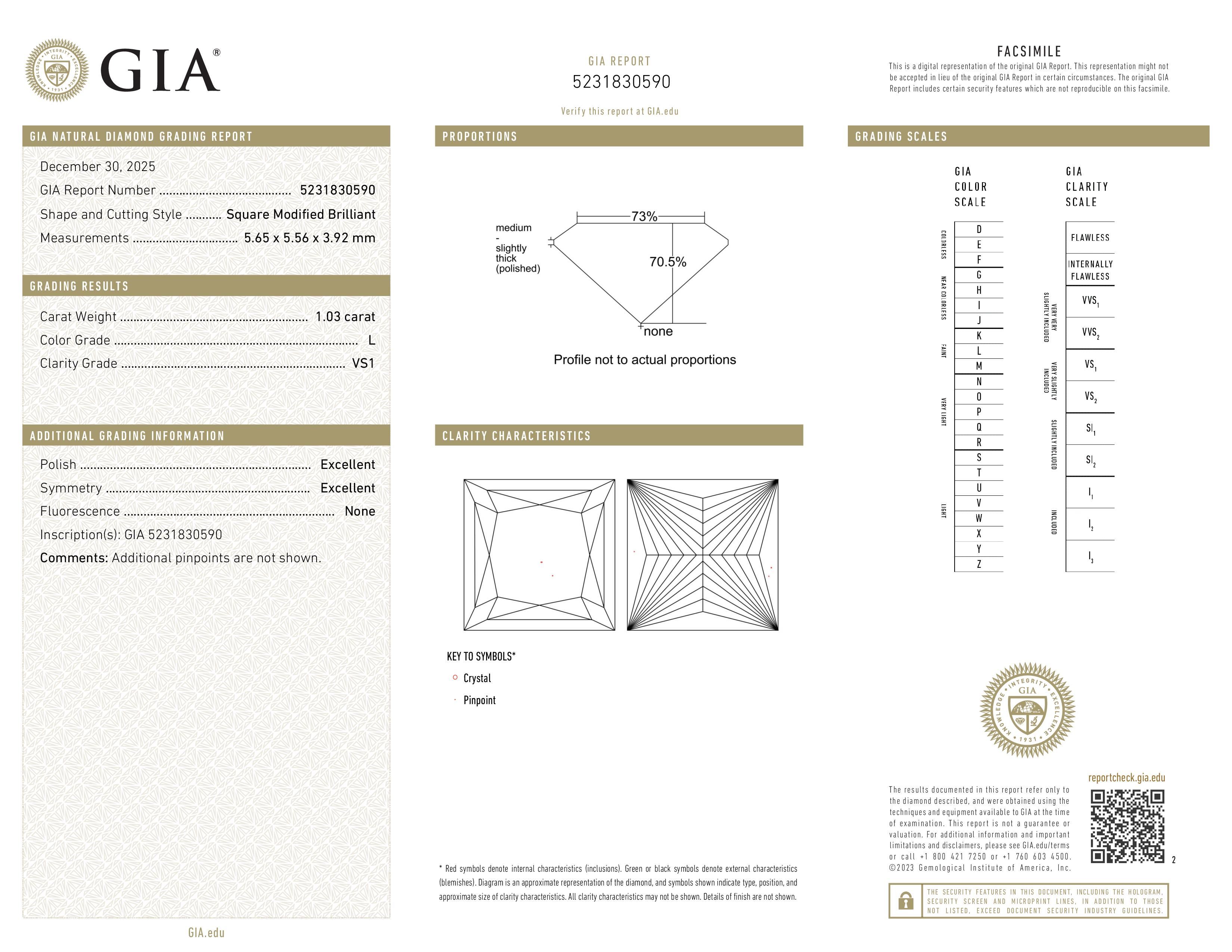 (VS1) This diamond contains very, few inclusions that are difficult for the untrained eye to see under 10x magnification. VS1 diamonds have no visible blemishes and are less expensive than higher clarity grades, therefore offering exceptional value while not compromising on quality.