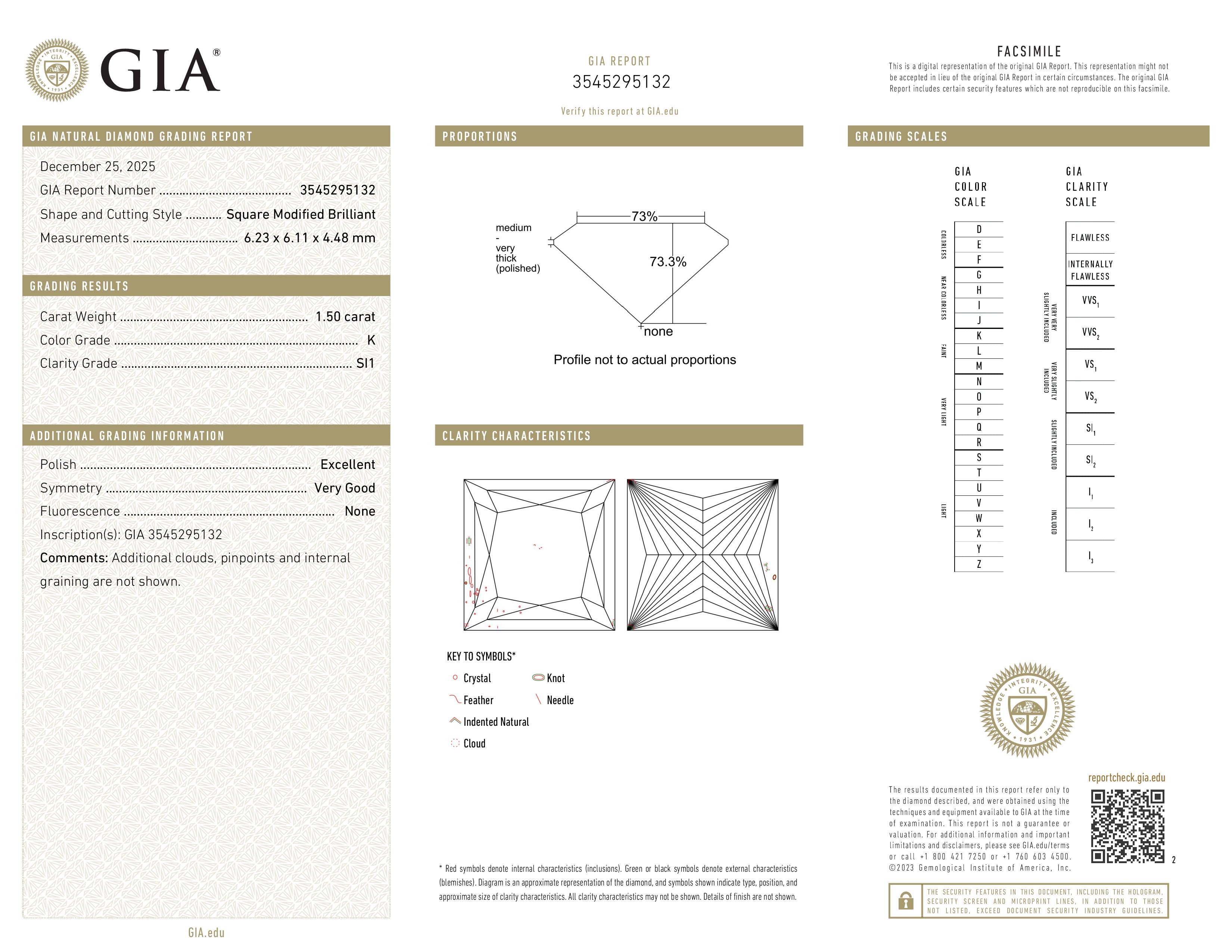 (SI1) This diamond contains few inclusions detectable using 10x magnification. However, when the diamond is set in jewelry, these inclusions are not usually visible to the naked eye. The SI1 graded diamonds are less expensive then higher clarity graded and therefore offer exceptional value for those that want to stay within budget and get a larger diamond. If you're unsure and want our opinion, just let us know and one of our gemologists will review it for you.