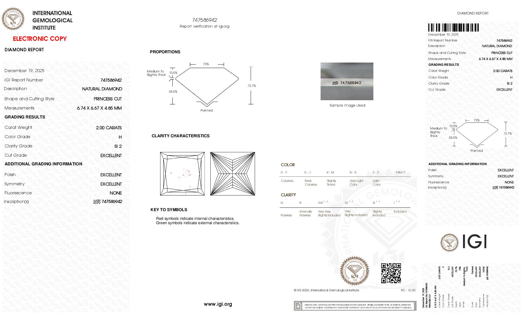 (SI2) Some inclusions are detectable under 10x magnification, even to the untrained eye. However, when the diamond is set in jewelry, these inclusions are not usually visible to the naked eye. The SI2 graded diamonds are less expensive then higher clarity graded and therefore offer exceptional value for those that want to stay within budget and get a larger diamond. If you're unsure and want our opinion, just let us know and one of our gemologists will review it for you.