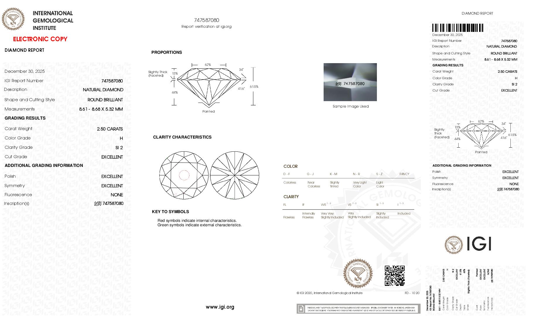 (SI2) Some inclusions are detectable under 10x magnification, even to the untrained eye. However, when the diamond is set in jewelry, these inclusions are not usually visible to the naked eye. The SI2 graded diamonds are less expensive then higher clarity graded and therefore offer exceptional value for those that want to stay within budget and get a larger diamond. If you're unsure and want our opinion, just let us know and one of our gemologists will review it for you.