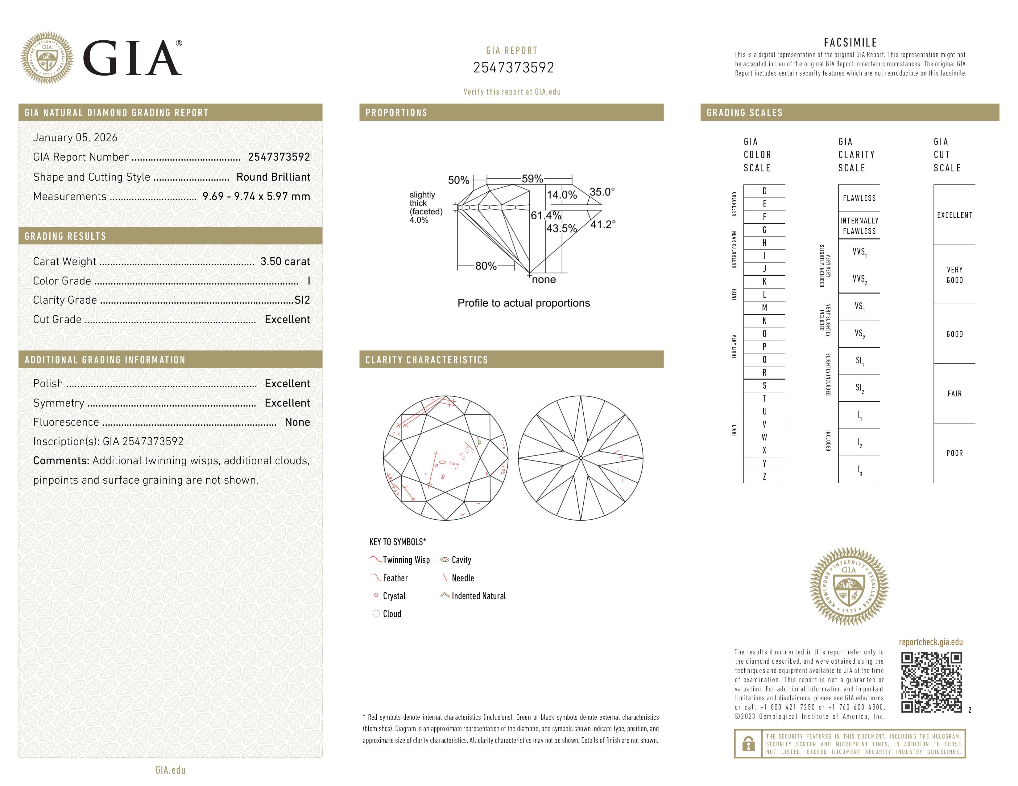 (SI2) Some inclusions are detectable under 10x magnification, even to the untrained eye. However, when the diamond is set in jewelry, these inclusions are not usually visible to the naked eye. The SI2 graded diamonds are less expensive then higher clarity graded and therefore offer exceptional value for those that want to stay within budget and get a larger diamond. If you're unsure and want our opinion, just let us know and one of our gemologists will review it for you.