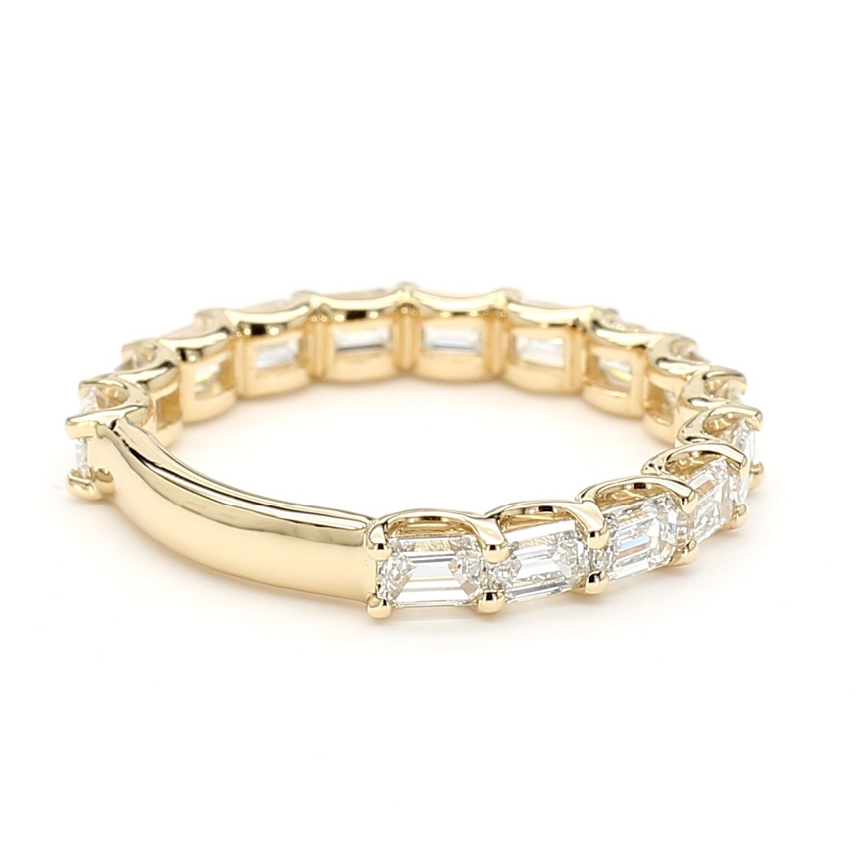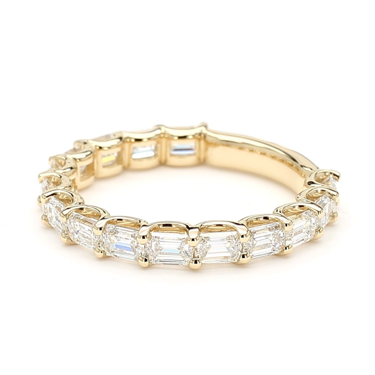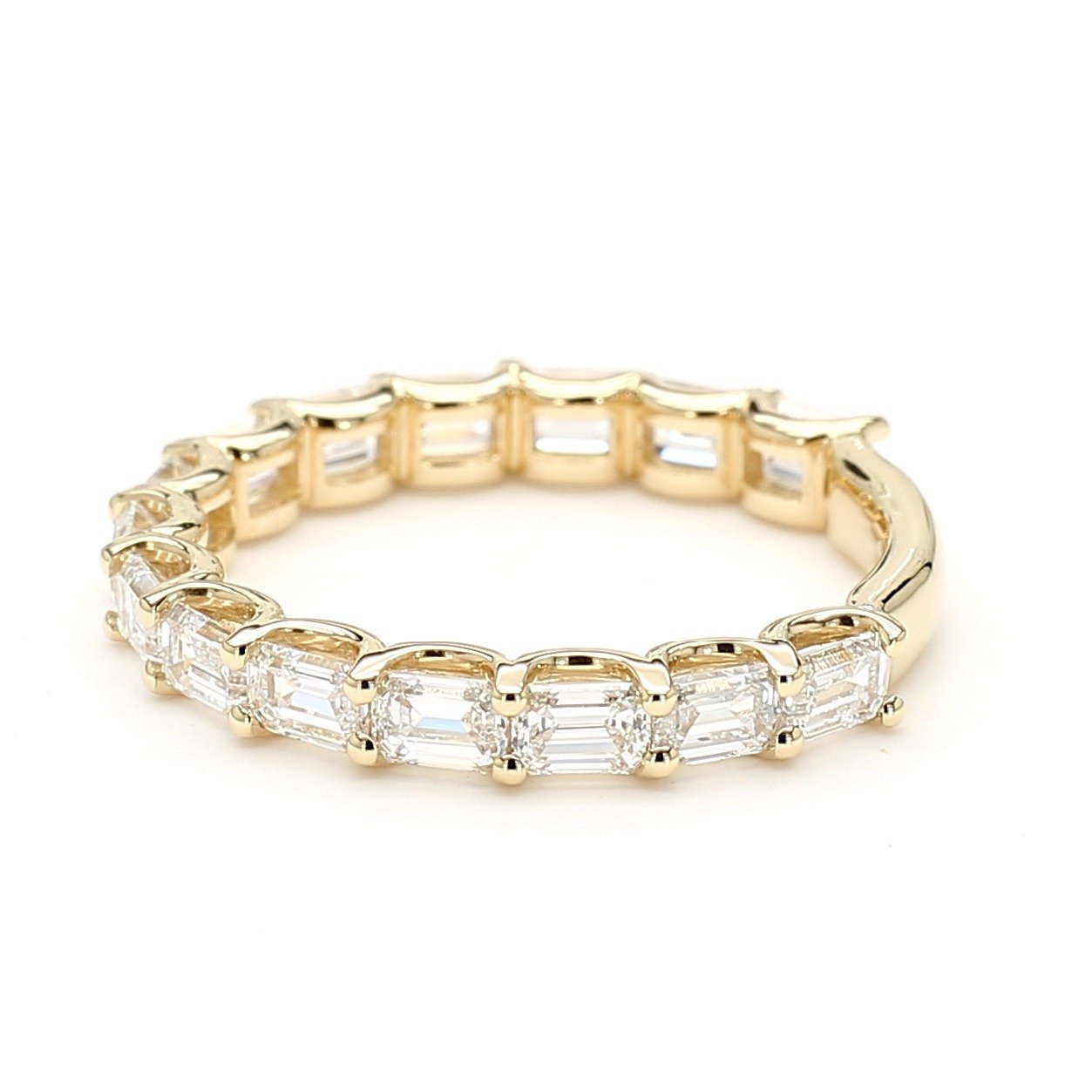 The emerald diamond engagement ring features a continuous line of emerald-cut diamonds set east-to-west, creating a sleek horizontal profile that emphasizes each stone’s step-cut geometry. Each diamond is secured in an individual four-prong basket that allows maximum light entry while maintaining stability, and the settings are linked seamlessly around the band for a refined, uniform look. The polished gold shank provides structural integrity and a smooth, comfortable fit, highlighting the elongated sparkle of the emerald-cut stones.