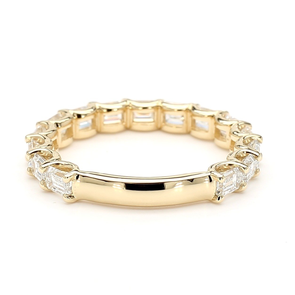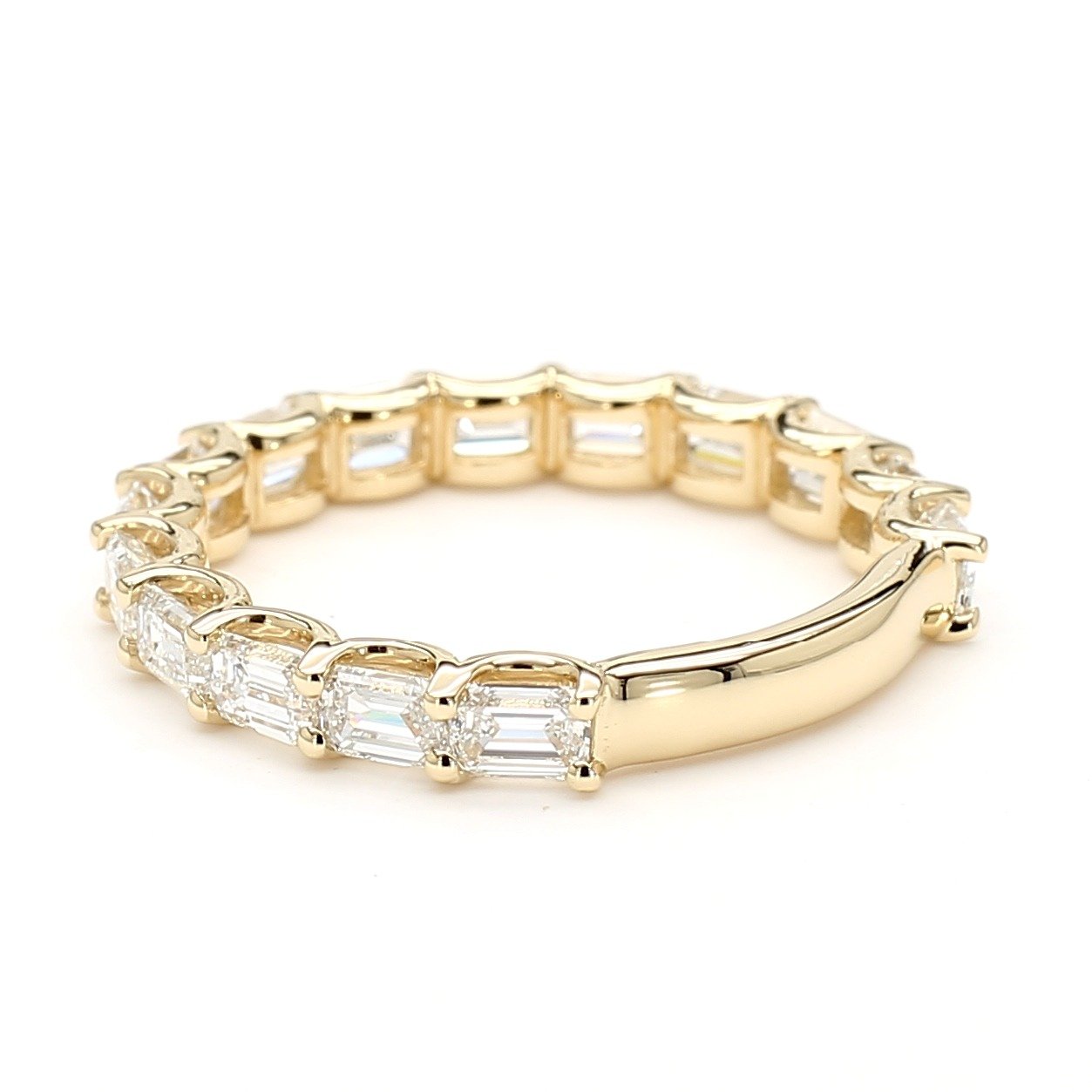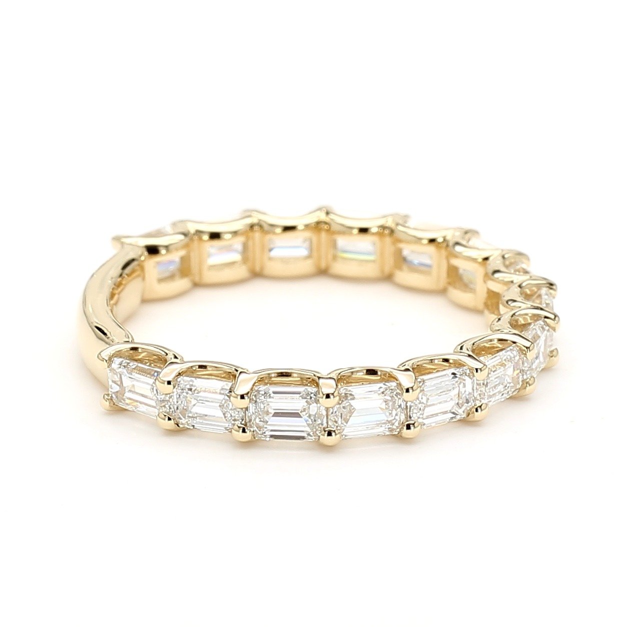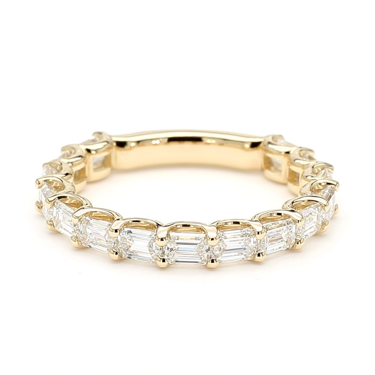 The emerald diamond engagement ring features a continuous line of emerald-cut diamonds set east-to-west, creating a sleek horizontal profile that emphasizes each stone’s step-cut geometry. Each diamond is secured in an individual four-prong basket that allows maximum light entry while maintaining stability, and the settings are linked seamlessly around the band for a refined, uniform look. The polished gold shank provides structural integrity and a smooth, comfortable fit, highlighting the elongated sparkle of the emerald-cut stones.